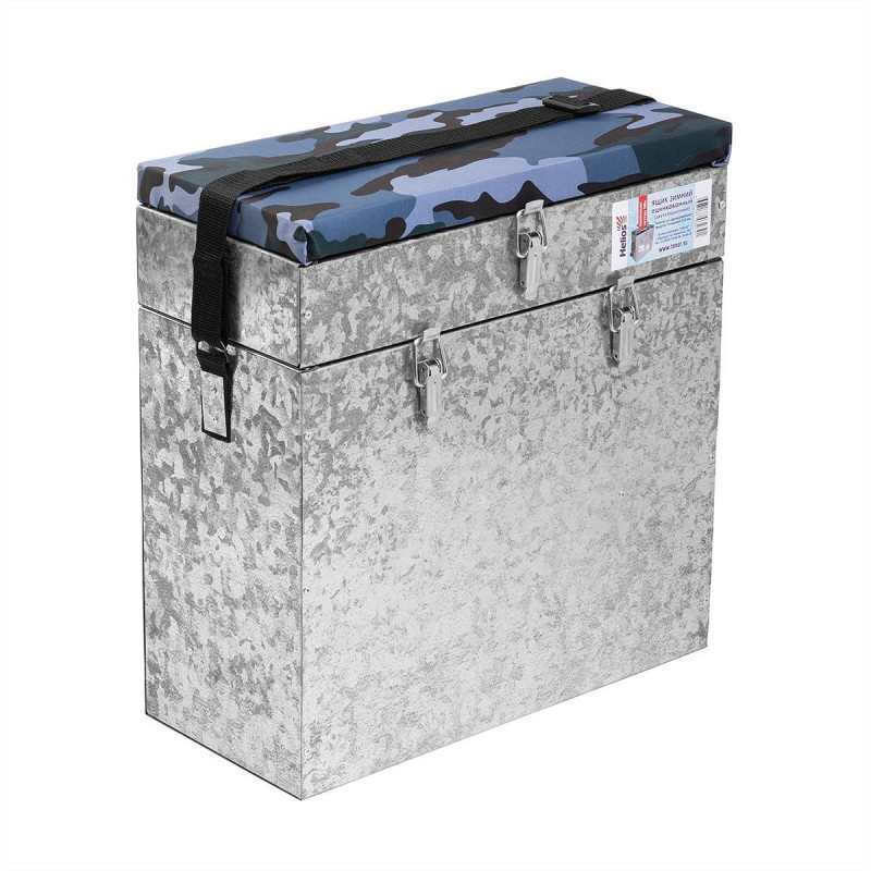 Ящик зимний оцинкованный Helios – вместительный ящик с теплой крышкой, предназначенный для хранения рыболовных снастей и пойманного улова. Имеет 2 отдела, разделённых перегородками.